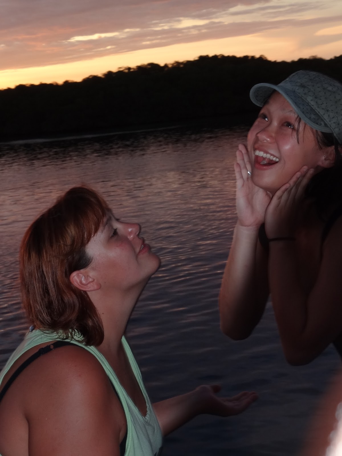 For us we did pose for a few pictures and got back to the boat to get to a spot were we could jump in and cool down. Aaaaaaaaaaah! Some swimming and snorkeling and for the last evening they had a special treat for us. There is a Mangrove forest from which every evening millions of bat fruit flies set out to feed on Flores. A fantastic sight to see millions of bats fly over our heads into the sunset. Wow! Made for some great pictures.